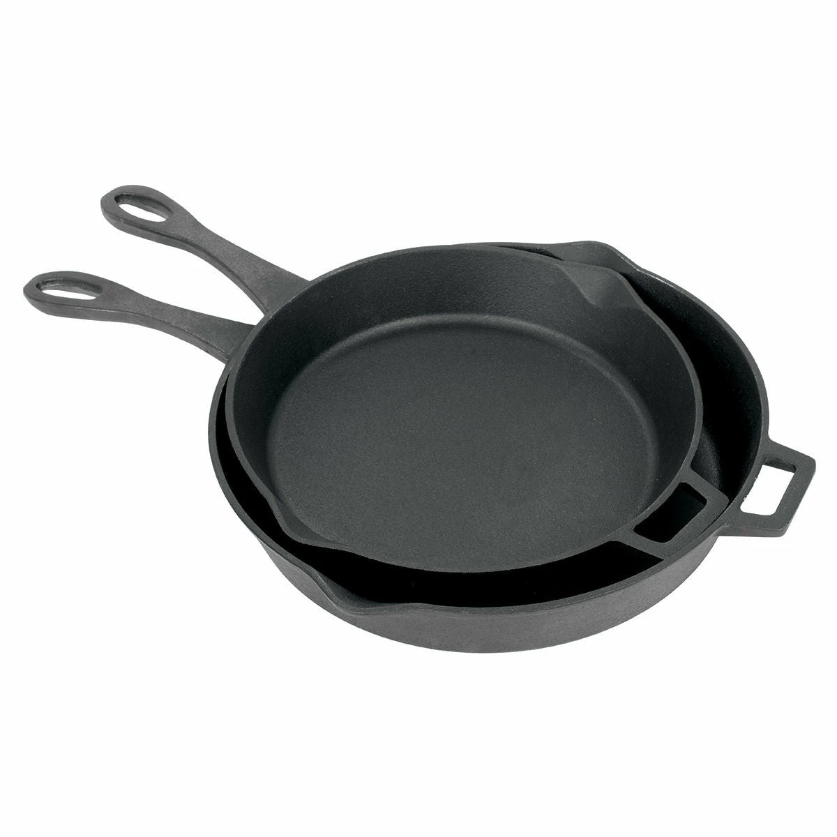 Bayou Classic 2 Piece Cast Iron Skillet Set sizes: 12″ & 14″. The Bayou Classic 2 Piece Cast Iron Skillet Set is a little more versatile in their use. These are not the skillets you would want if you are looking to cook a few eggs. These are more for bigger foods. These cast iron skillets do include eyes in the handle for hanging.