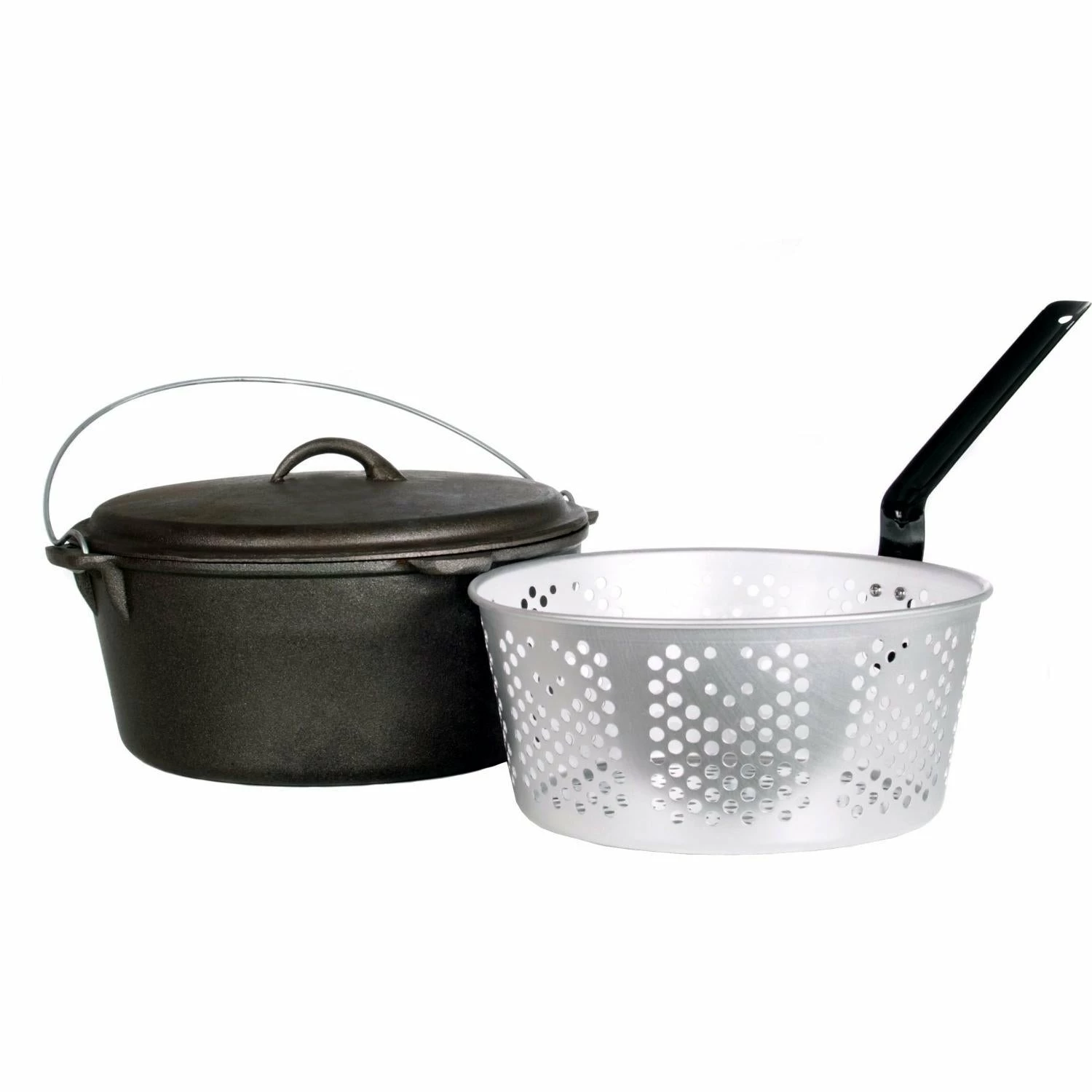 The Cajun Classic dutch oven is made of Heavy-duty seasoned cast iron and includes a lid and perforated aluminum basket perfect for frying. Interior measures 11. 5 inches wide x 5. 25 inches deep. This Cajun Classic dutch oven is pre-seasoned to perfection and ready for use. Cast iron cookware makes for superior heat retention and even heating of foods. Heavy-duty and durable, designed to last for years. Hand wash with stiff brush and hot water.