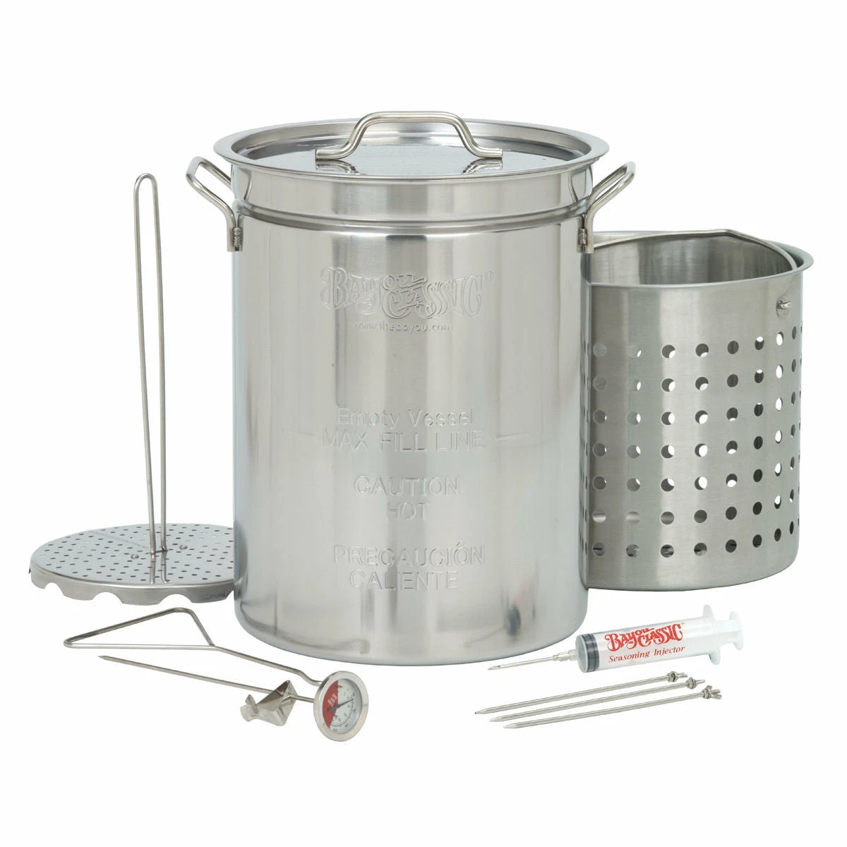 The Bayou Classic Stainless Steel Turkey Fryer Pot is a 32 quart stainless steel turkey fryer pot. It’s the perfect size to fry a perfect turkey or boil the perfect pot of crawfish. This stainless steel turkey fryer pot is our best selling pot out of all of our turkey fryer pots. The Bayou Classic Stainless Steel Turkey Fryer Pot includes all stainless steel turkey fryer accessories. These stainless steel turkey fryer accessories are dishwasher safe. The stainless steel used to make this pot is 18/8 gauge stainless steel, which is commercial grade. Unlike the competitors pots you find in the “Mart” stores, you kick this one . . . you hurt your foot and not the pot. The Bayou Classic Stainless Steel Turkey Fryer Pot includes the stainless steel turkey fryer pot, stainless steel turkey fryer basket, vented lid, stainless steel perforated poultry rack and grab hook, stainless steel turkey fryer thermometer, trail seasoning injector (not stainless steel) and 3 piece chicken skewer set. The Bayou Classic Stainless Steel Turkey Fryer Pot is the premium choice for those who demand the highest quality products for their outdoor cooking needs. The Bayou Classic Stainless Steel Turkey Fryer Pot measures 12 inches x 17 1/2.